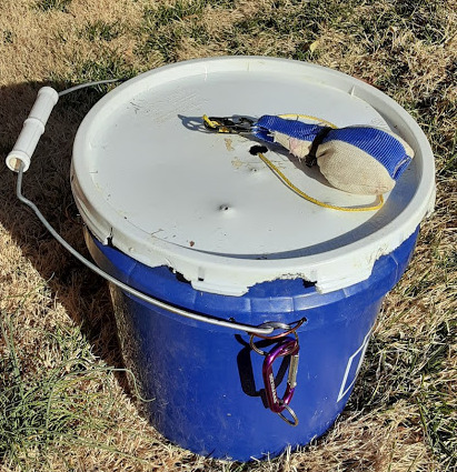 Use of the arborist’s throw bag was suggested by Joe Devencentis (KO8V) during one of the informal “Panera” gatherings. The throw bags have an accuracy advantage over slingshots, with comparable range. They have less range than potato cannons, but are faster to use, since a thicker throw line is used, which can directly pull over the final “parachute cord” line, as compared to a potato cannon which uses monofilament line to pull over an intermediate line prior to pulling over the final line. The thicker line on the throw bag may also work better in high winds, where the very light potato cannon lines may drift. But the ideal weather for this installation did not require testing that supposition.